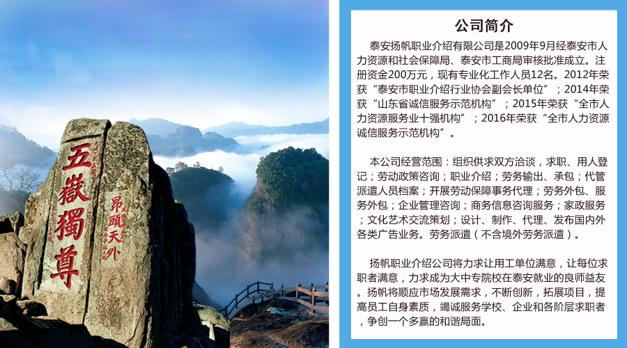泰安揚帆職業(yè)介紹有限公司是2009年9月經(jīng)泰安市人力資源和社會保障局、泰安市工商局審核批準(zhǔn)成立。注冊資金200萬元,現(xiàn)有專業(yè)化工作人員12名。2012年榮獲“泰安市職業(yè)介紹行業(yè)協(xié)會副會長單位”;2014年榮獲“山東省誠信服務(wù)示范機構(gòu)”;2015年榮獲“全市人力資源服務(wù)業(yè)十強機構(gòu)”;2016年榮獲“全市人力資源誠信服務(wù)示范機構(gòu)”。